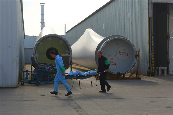 本次演練模擬連云港工廠(chǎng)10#油漆車(chē)間因電器隱患發(fā)生火災,導致大量物資和人員被困。9點(diǎn)50分,各參演隊伍集結完畢準備演練。10點(diǎn)整,通訊組接報警、報告火情,第一時(shí)間啟動(dòng)消防應急預案,向119報警后開(kāi)展初期火災滅火、人員疏散、救護、物資轉移、警戒、切斷廠(chǎng)區雨水排口等搶險工作,葉片生產(chǎn)部機修電工切斷火災現場(chǎng)電源、對儲氣罐進(jìn)行人工卸壓防范爆炸,消防泵房啟動(dòng)加壓水泵。隨著(zhù)火情不斷擴大,模擬的相鄰油漆車(chē)間發(fā)生著(zhù)火,向110、120報警后繼續組織滅火。10點(diǎn)15分,接警后開(kāi)發(fā)區消防救援隊三輛消防車(chē)入廠(chǎng)開(kāi)展滅火救援,期間,通訊組向消防救援隊報告車(chē)間可能還有人員,救援隊使用專(zhuān)用工具強行破拆變形大門(mén),對車(chē)間內部迅速開(kāi)展搜救,并將被困人員救出。10點(diǎn)20分,火災得到控制并完全滅火,總指揮指示清點(diǎn)人員、盤(pán)點(diǎn)物資、檢查損失、檢查消防尾水等工作。