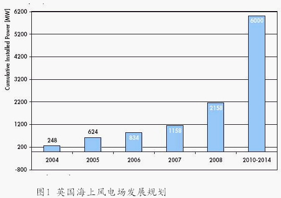 從圖1可以看出,英國在2006年海上風(fēng)電場(chǎng)的規模將達到83.4萬(wàn)千瓦,在2010年到2014年期間海上風(fēng)電場(chǎng)的規模將達到600萬(wàn)千瓦