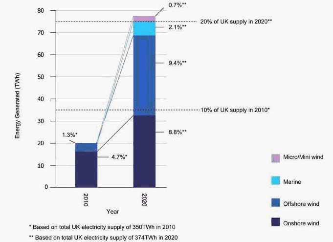 由圖2可知,在2010年陸地風(fēng)電場(chǎng)的發(fā)電量將占英國總發(fā)電量的4.7%,海上風(fēng)電場(chǎng)的發(fā)電量將占總發(fā)電量的1.3%;到2020年,陸地風(fēng)電場(chǎng)的發(fā)電量將占英國總發(fā)電量的8.8%,海上風(fēng)電場(chǎng)的發(fā)電量將占總發(fā)電量的9.4%,海洋能將占總發(fā)電量的2.1%,小型風(fēng)力發(fā)電機的發(fā)電量將占總發(fā)電量的0.7% 。