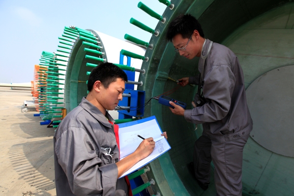 目前中復連眾生產(chǎn)的葉片最短的有34米,最長(cháng)的達到超過(guò)60米,這就造成擺放這些葉片的場(chǎng)地非常大,連云港生產(chǎn)基地的貨場(chǎng)大約300畝。廣闊的貨場(chǎng)繞行一周至少需要半個(gè)小時(shí),工作內容暫且不說(shuō),光是每天在貨場(chǎng)上來(lái)回走上幾趟,很多人都吃不消,加上酷暑寒冬,風(fēng)吹雨淋,讓人望而生畏。葉片噴漆完畢到等待發(fā)貨這段時(shí)間,賈效博會(huì )將對葉片進(jìn)行航空標識、內部檢查、后緣厚度、螺栓、葉片翼型檢查、人孔板等14個(gè)大類(lèi)60多小項的檢查,從根部到尖部,從外表面到葉片內里,有的需要肉眼觀(guān)察,有的需要儀器測量,需要嚴格對照工藝要求,逐項檢查,對檢查到的不合格項還要反饋給相關(guān)部門(mén),請他們處理,然后再進(jìn)行一輪檢查,直至符合出廠(chǎng)標準。遇到發(fā)貨時(shí)間比較急,或者是出口訂單,他的任務(wù)就更艱巨了,加班加點(diǎn)不說(shuō),對同一只葉片他要看好幾次,確認沒(méi)有問(wèn)題了,他才會(huì )給客戶(hù)監理看。