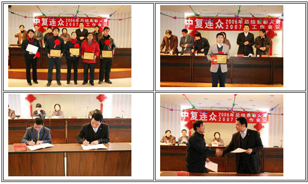 2007年元月31日下午,中復連眾2006年總結表彰大會(huì )暨2007年工作會(huì )議在集團公司辦公大樓五樓多功能廳召開(kāi),公司全體員工參加了會(huì )議。會(huì )上,喬光輝總經(jīng)理總結了2006年工作,布置了2007年工作任務(wù),陳立友主席宣讀了關(guān)于《表彰2006年度先進(jìn)個(gè)人、標兵、先進(jìn)集體的決定》,由集團公司領(lǐng)導頒發(fā)了獎金、獎牌。為了做好07年的工作,喬光輝總經(jīng)理同各子分公司、事業(yè)部簽訂2007年經(jīng)營(yíng)責任書(shū)。最后,中復集團公司副總經(jīng)理、中復連眾集團黨委書(shū)記、董事長(cháng)任總作了重要講話(huà),由耿婷芳副總經(jīng)理作會(huì )議總結。圖為公司領(lǐng)導與各事業(yè)部主要負責人簽訂2007年經(jīng)營(yíng)責任書(shū)與公司領(lǐng)導為標兵等頒獎的照片。