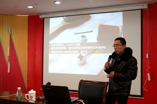 在培訓中,刁主任通過(guò)多媒體和現場(chǎng)實(shí)際演示的方式向大家講解了一些如:止血、包扎、骨折固定與搬運、心肺復蘇等日常急救常識?;顒?dòng)過(guò)程中,廣大員工認真聆聽(tīng)、記錄,最后刁主任給大家現場(chǎng)演示心肺復蘇,并邀請了兩名員工進(jìn)行演練。