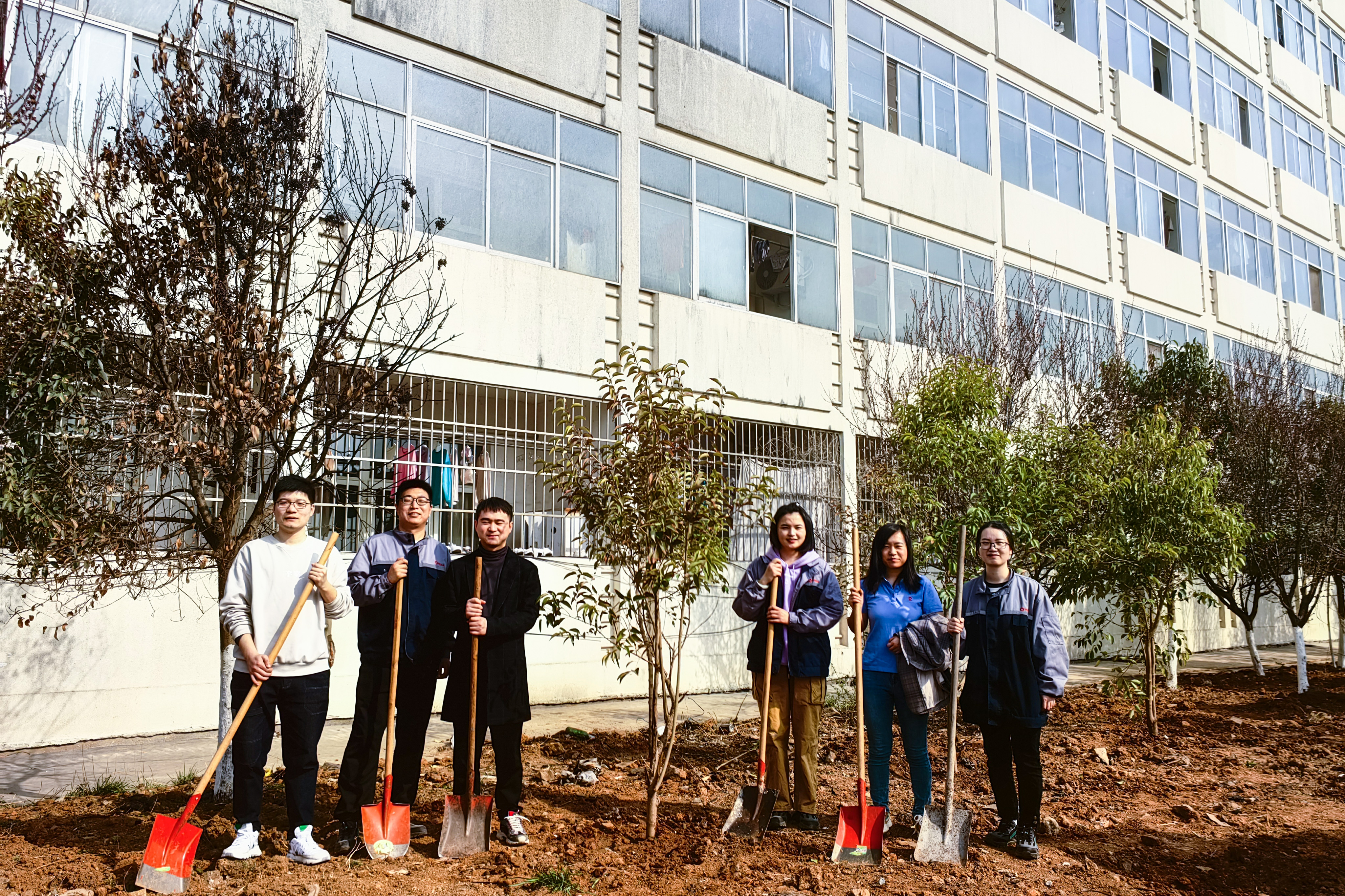 活動(dòng)分別設在科研樓和連云港葉片工廠(chǎng)大浦工廠(chǎng),科研樓現場(chǎng)主要是栽新苗增綠,大浦工廠(chǎng)現場(chǎng)主要是移苗護綠。在栽苗現場(chǎng),大家手持鐵鏟、分工協(xié)作,有的揮鏟掘坑、有的扶苗校正、有的培土圍堰、有的提水澆灌……每個(gè)環(huán)節都井然有序,每道工序都認真細致、一絲不茍,確保栽一棵活一棵。在挖苗現場(chǎng),大家在保護好樹(shù)苗根部的前提下將樹(shù)苗挖起,并借助工具車(chē)將樹(shù)苗移至新地栽種,集中力量對移植的樹(shù)木做好澆水定根工作,確保移一棵活一棵。本次活動(dòng)大家相繼種下了大葉女貞、山楂、薔薇、月季等20余棵不同種類(lèi)的苗木,青翠的樹(shù)苗在明媚的陽(yáng)光中迎風(fēng)而立,展現出盎然生機和蓬勃活力。